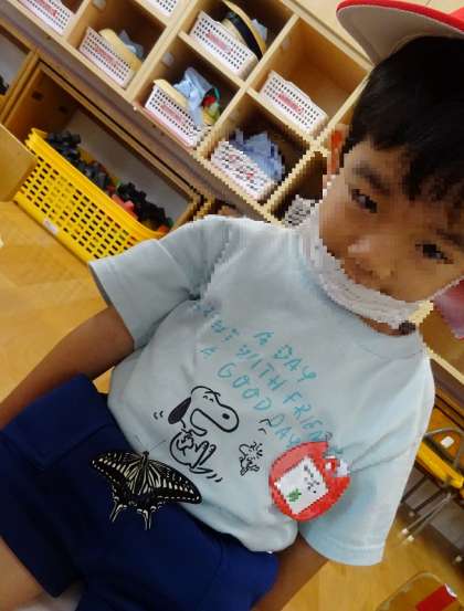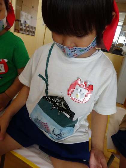 そ〜っと虫かごから出してみると、、、保育室の中を飛んだり、子どもたちの体に止まって一休みしたりしていました。体の上をゆっくり登ってくるアゲハチョウを見て、とても嬉しそうにしていましたよ!