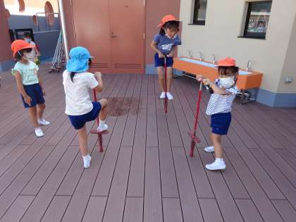 はじめはおそるおそるだった子どもたちも、だんだん慣れてきて、くぐったりとんだりしながら遊んでいます。