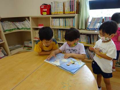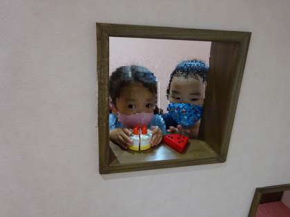 今日は2階の絵本室やDEN(デン)で遊びました。憧れの2階だったので、大喜びでした!DENから顔をのぞかせたり、ゆったり絵本を読んだりと楽しかったですね。