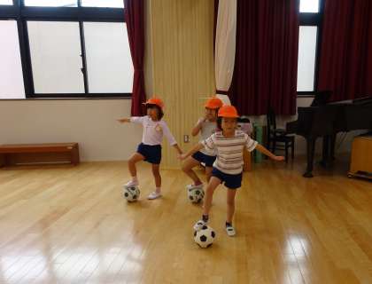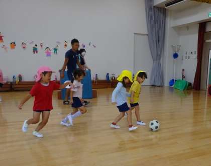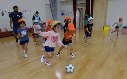 3歳児、4歳児は、下石先生とどちらがたくさんゴールできるか勝負です。今日の勝負は、伝法幼稚園チームの勝利でした。