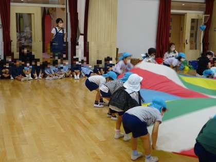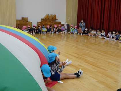 遊戯室で年長児のパラバルーンを見せてもらいました。友達と心を合わせて取り組む姿を射て子どもたちも思わず拍手をしていました!明日の運動会でもぜひ大拍手をお願いします!