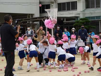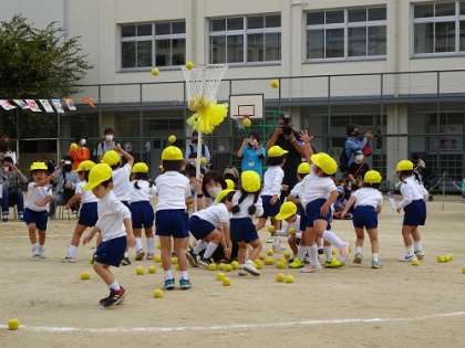 4歳児のダンシング玉入れです。 ダンスをしたり、玉入れしたり、忙しく楽しい競技です。
