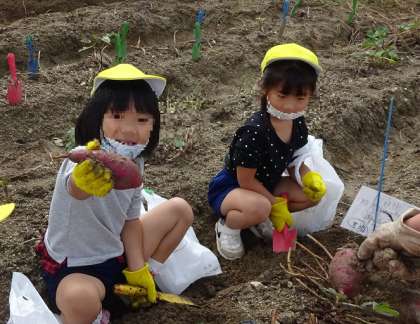 掘れたお芋を友達と見合ったり、大きさ比べをしたりしていました。自然の生り物なので、個数や大きさ、形もそれぞれですが、自分で掘ったお芋は特別で、とても嬉しそうでした。「帰ったら天ぷらにしてもらう!」「お芋ご飯が食べたいな!」など、掘ったお芋がどんな料理になるのか楽しみにしていましたよ!