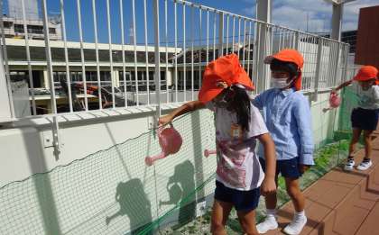 現在工事中で畑が無いため、子どもたちが少しでも野菜に親しみをもてるよう、2階のデッキに冬野菜を植えています。