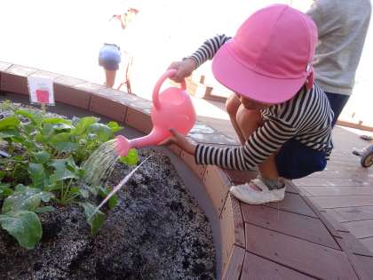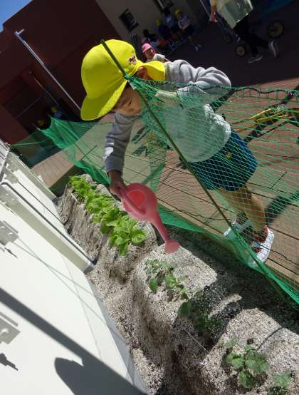 表示を見ながら「これはブロッコリー」「白菜もある!」と興味を持って水やりをし、育つのを心待ちにしている子どもたちです。