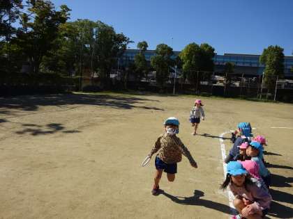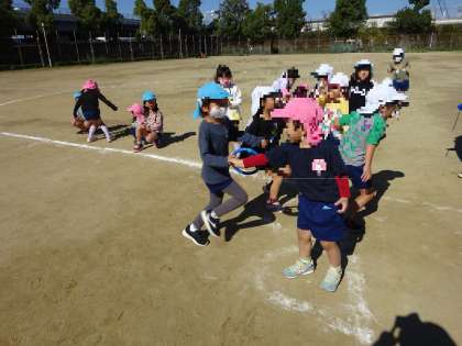 そら組・ゆき組でリレーをして遊びました。そら組さんに、リレーのルールを教えてもらいながらゆき組も思いっきり走ることを楽しみました!憧れの年長児と遊べたことがとても楽しかったようです。