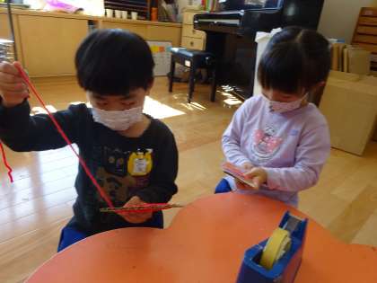 段ボールを小さく切って切り込みを入れ、毛糸を引っかけて巻く遊びをしました。