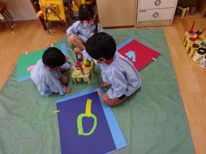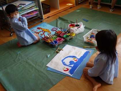 ご飯を食べて、やりたい子どもたちだけ自由に絵の具遊びをしています。