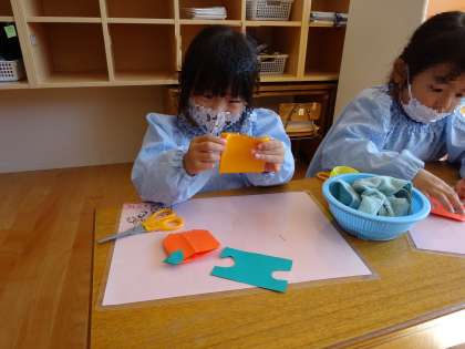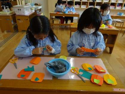 折紙でみかんを折りました。折るときに”端をそろえること”、”折り目をしっかりつけること”を知らせると、何回か経験してきたこともあり、丁寧に折る姿が見られました。楽しかったようで「もう1回する!」と、何度も折ることを楽しみました!