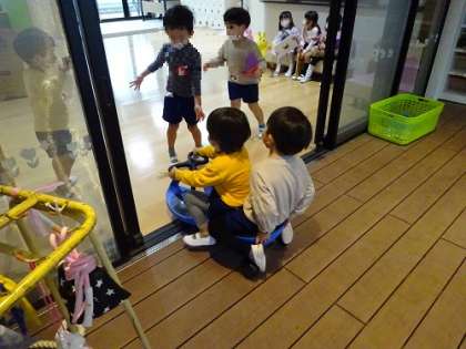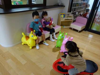 スイングカー 公開日 2022/11/01 更新日 2022/11/01 お知らせ 登園してきてすぐにスイングカーに乗っています。 回遊性のある園舎ですので、テラスから、廊下からグルグルまわって遊んでいます。雨でもテラスがあるので、雨にはかかりません。 順番を待つ子どもたちはソファーに座って待っています。 いいね(0)