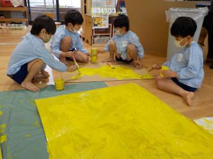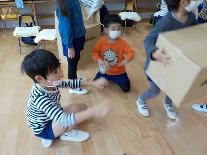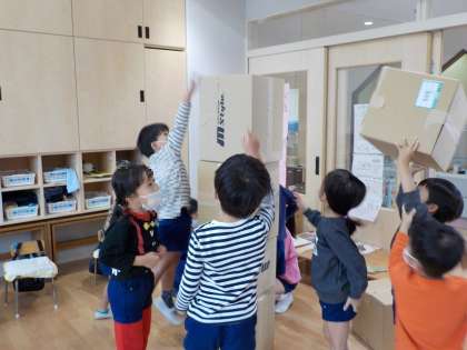 段ボール製作(5歳児) 公開日 2022/11/01 更新日 2022/11/01 お知らせ 今日は一日雨でしたが、つくったりかいたりする遊びを存分に楽しんでいました。 「ペンキ屋さんになったみたいやな!」とぬたくりをしたり、高さを相談しながら積み上げたり、友達と協力し合いながら遊び進めています。 何ができあがるかは、まだお楽しみに!です。 いいね(0)