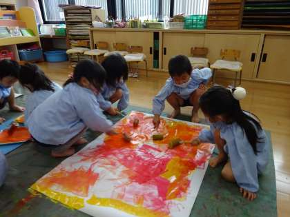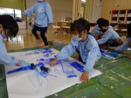 絵具をつけてコロコロと転がすと、ローラーの道ができ、それが友達の色と重なり合って、きれいな模様や色の変化も楽しんでいました。