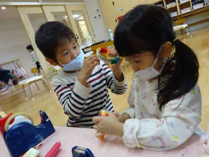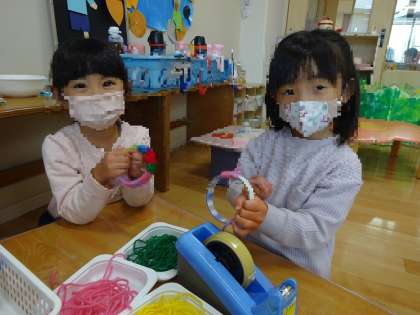 先日は段ボールに毛糸を巻いていく遊びをしていましたが、今回はセロハンテープの芯に毛糸を巻いていく遊びをしました。芯の真ん中を通して巻く、ということを繰り返すのですが、最初は「通す」ということがわかるまでグルグルと外側を巻いている子もいました。しかし、コツが分かるとどんどん毛糸が巻かれて色がついていくのが面白くなり、「次は赤色にしよ!」「もこもこの毛糸も巻きたい!」「先生、もう一個つくっていい? 」と楽しんでいました。出来上がったのを見て、「カラフルドーナツみたい♪」と喜んでいた子もいましたよ。指先を使う遊びをたくさんしていきたいと思います。