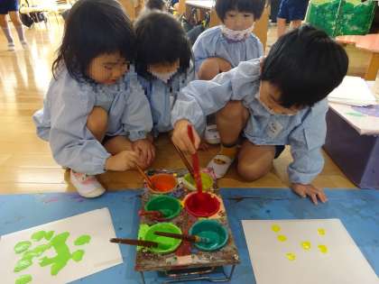色と色が混ざり合っているところを見て「先生、ここ見て!きれいやな〜」と喜んでいました。「もう一回やりたい」と何度も繰り返し楽しんでいる子もいましたよ!こういう技法は何度しても、その都度出来上がる色合いや模様が違うので、繰り返しする楽しさが存分に味わえる遊びでした。