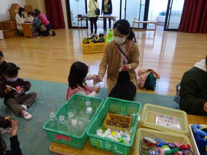 遊戯室で、どんぐりなど素材を使って楽器をつくったり、紙皿でリースをつくったり、園庭でほし組、ゆき組の子どもたちと遊んだりしました。おうちの方と一緒に、模様をつけたり、毛糸を巻いたりと、素敵な楽器やリースが出来上がっていました。