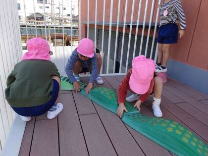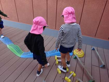 ウッドデッキで遊ぶのが大好きな子どもたち。三輪車やスケーターに乗って遊ぶことを楽しむことが多いですが、今日はサーキットの道のパーツを見つけました。「迷路つくろう!」と、友達と一緒に迷路をつくっていました。「もっと長い迷路にしよう」と、どんどんつないでいき、長い迷路が完成しました。「ここで遊んでもいいよ」と、友達にも声をかけ遊ぶことを楽しんでいました。