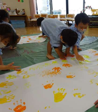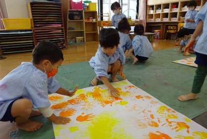 「絵具で遊ぶよ〜!」と話すと、嬉しそうないちご組さんたち。