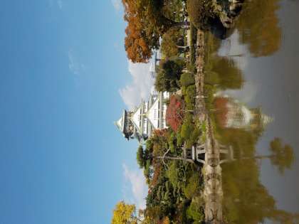 写真中 秋の風景の中の大阪城。お池にはカモが泳いでいました。