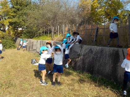 途中、どんぐりや葉っぱを拾ったり、探検ごっこをしながら歩き、幼稚園に帰るまで元気いっぱいでした!