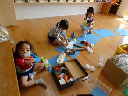 お家の方が持ってきてくださっている素材を使って、並べて遊び、その後、テープで引っ付けて遊んでいます。
