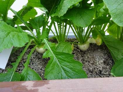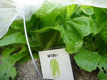 2階のテラスに野菜を植えています。園庭がないので、主事の奥村さんが、植えてくださいました。