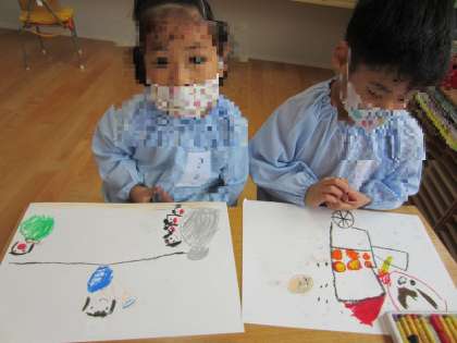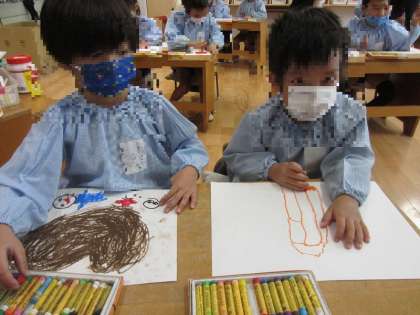 クラスで読んでいる絵本の中で、子どもたちのお気に入りのお話をクレパスでかきました。