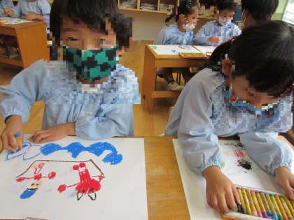 力強く塗り込んだり、紙いっぱいにかいたりして、お気に入りのところ、面白いところなど自分のお気に入りのお話をかいていました。