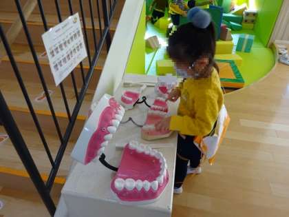 歯の模型を置いておくと、子どもたちは『磨き方』を見ながら模型で歯磨きをしています。