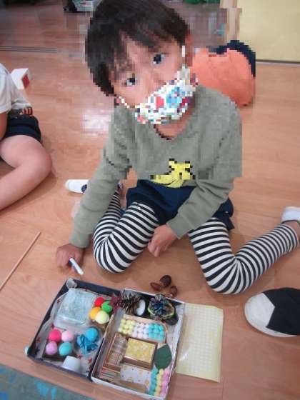 お家から持ってきてくださった箱で、ドングリの家や公園などをつくっています。