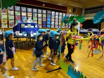 看板も作品の一つです。幼稚園の「こども展覧会」の看板も全クラスの作品が集結しています。