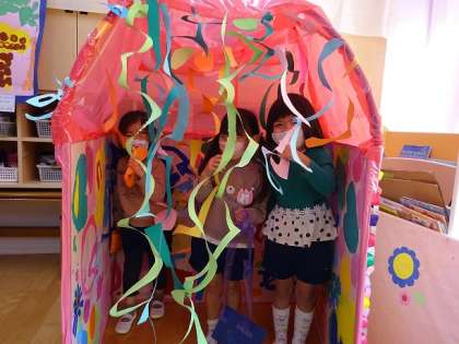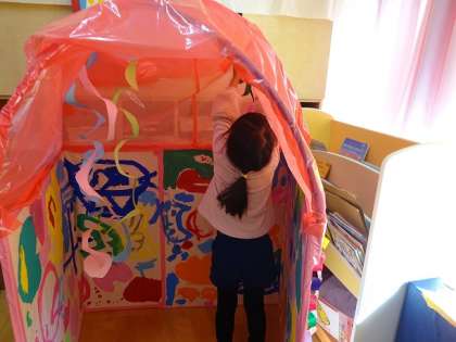 こども展覧会でお家をつくりました。そのお家に「飾りつけしたい!」と、たくさん飾りつけをしていました。(写真1枚目)