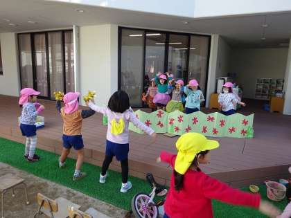 「外でもマイクもってお歌したい!」と声があり、ウッドデッキにステージをつくると、たくさんお客さんが来てくれましたよ。お客さんも一緒になって踊っていました。(写真3枚目)
