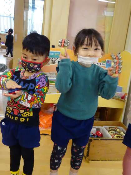 お部屋にカスタネットと鈴を置いていると、好きに鳴らして遊んでいました。