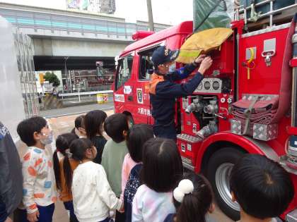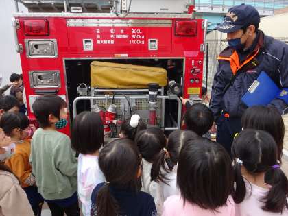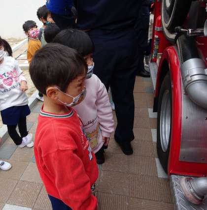 消防車すごいね!(4歳児) 公開日 2022/12/05 更新日 2022/12/05 お知らせ 今日は火災の避難訓練をしました。その様子を消防士の方に見ていただきました。みんな避難をできていましたよと褒めていただきましたよ!そして、消防車も見せてもらいました!こんなに近くで消防車を見られることがないので、大喜びです。消防士さんに「このボタンは何?」「これは?」と、質問をすると、丁寧に答えてもらいました。とても貴重な機会となりました。 いいね(0)