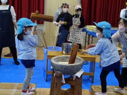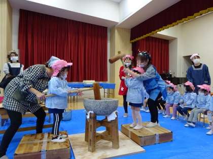 おもちつき 公開日 2022/12/09 更新日 2022/12/09 お知らせ 今日はおもちつきでした! 園庭を工事しているので、遊戯室でもちつきしました。 全員おもちつきの杵をもって餅つきを経験しました。 重い杵をもって子どもたちは楽しんでいました。 幼稚園では伝統行事を大切にしています。 家ではなかなかできない貴重な経験ができました。 いいね(0)