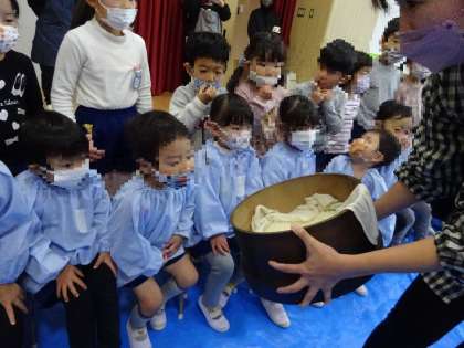 蒸しあがったもち米を見せてもらうと「いい匂いがしてる〜」「もくもくしているよ」と嬉しそうにつぶやいていましたよ♪
