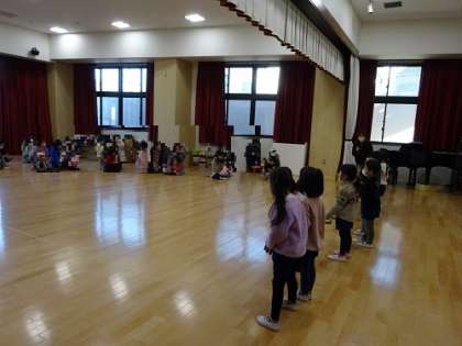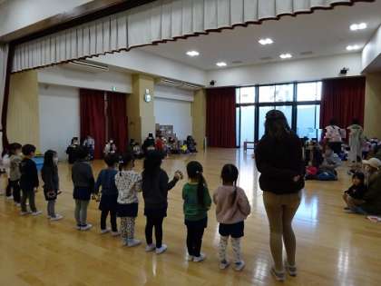 今日は、楽器で遊ぼうの日でしたので、在園の4歳児が歌「あわてんぼうのサンタクロース」の歌を披露し、スズの演奏を披露しました。そのあと、未就園児の子どもたちがスズで遊びました。