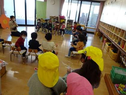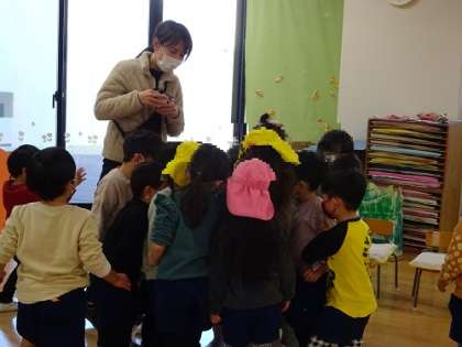 見つけた氷を見せたくて、3歳児に保育室に運んでいます。