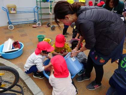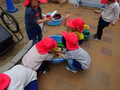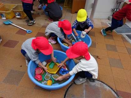 今まで使っていた砂場の遊具を洗ったり、自分のロッカーを整理してり…。
