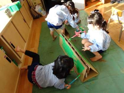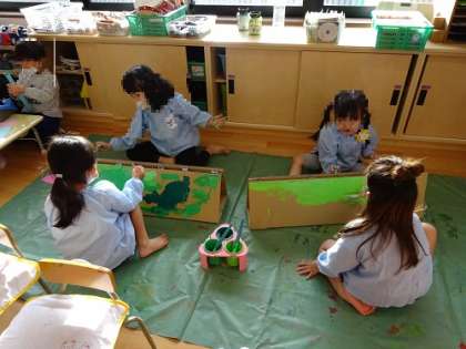 2階の年長の保育室には、ツノがあり、年中の保育室には、色を塗って作っている子どもたちがいました。どんなことが始まるのか楽しみです!