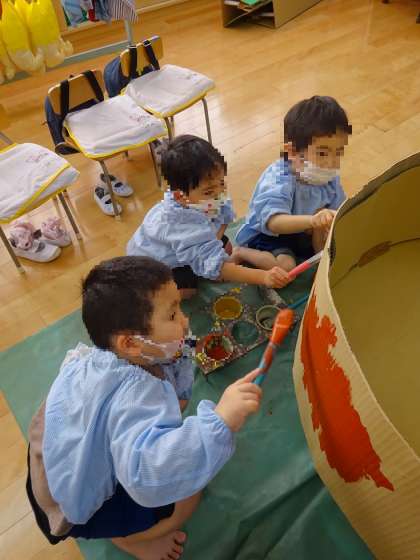 みんなでお鍋をつくったよ! 公開日 2023/01/12 更新日 2023/01/12 お知らせ 2学期から「おなべおなべにえたかな」のお話で遊んでいました。今日は大きなお鍋にみんなで絵具を塗りました。 「こっちまだ塗れてないで〜」「じゃあ手伝うわ!」と力を合わせて大きなお鍋が出来上がりました。絵の具の後は、「先生、ここ絵の具ついてるからお掃除したい!」と自分たちで汚したところをきれいにしていましたよ!! いいね(0)