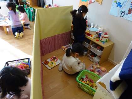 劇遊びに使う道具を自由の遊びの時に作ったり、大道具をままごとで使い、その世界観を楽しんだり、生活の中に自然と溶け込んでいます。