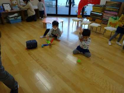 登園してきてすぐに、手回しコマを楽しんでいる子どもたちです。