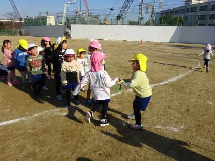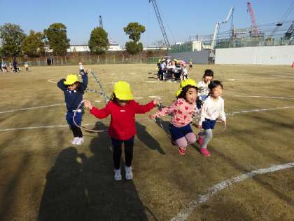 縄跳びでは友達と一緒に跳ぶことが楽しくなっていて、縄を交差させて一緒に持って跳ぶ、向かい合って跳ぶ、など工夫して遊んでいましたよ!