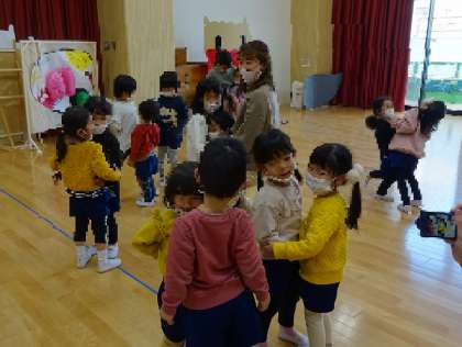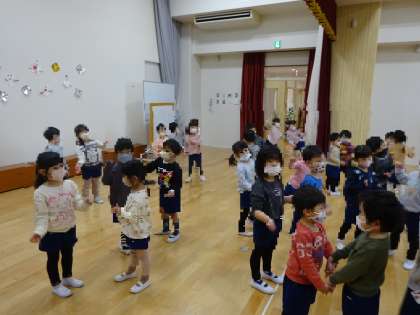 いちご組、ほし組、ゆき組で「ひっつきもっつき」の仲良し遊びをしました。違うクラスのお友達と一緒に手をつないだり、いろいろなところをひっつきっこして遊んだり、楽しんでいましたよ♪
