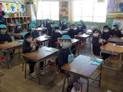 年長組が、伝法小学校の1年生の授業と給食準備の様子を参観させていただきました。
