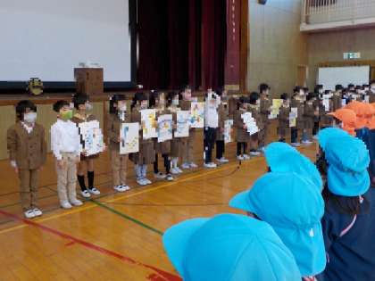 そして、1年生の児童にみなさんが、絵と作文で小学校の生活や楽しい行事を紹介してくれました。自分たちで考えた絵と文を、はきはきと前で発表してくれる様子は本当に素敵で、年長児の子どもたちは憧れの気持ちをもって見ていました。