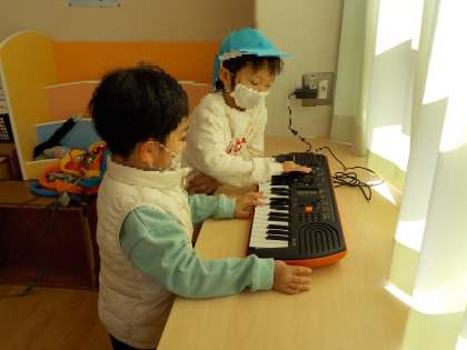 探り弾きをしたり、リズムや音楽を鳴らしたり、面白い音が鳴ったら笑い合ったりしています。