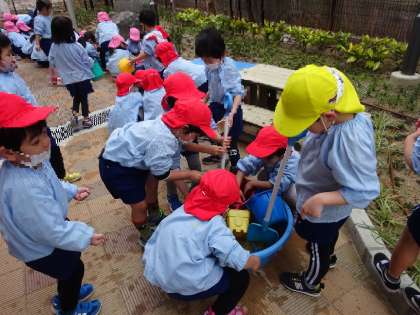 来年度の新しい砂場で楽しく遊べるように、今日はみんなで砂場の遊具をきれいにしました。寒い日でしたが、お湯が入っているタライに手を浸けると、、、「あったか〜い!!」と喜んでいました。「先生、きれいになった?」と聞きながら、楽しく洗いました。
