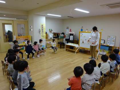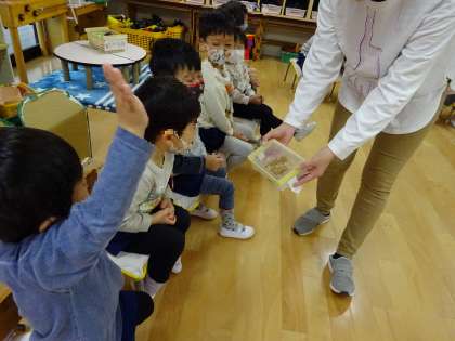 「こんなうんち出たことあるかな?」とうんちの模型を見せてもらうと、「あるある〜!」「これはないかな〜?」といちご組さん。